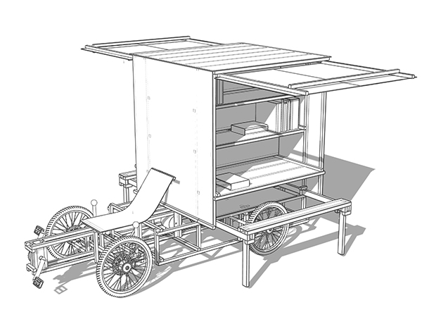 The XYZ CARGO MOBILE LIBRARY enables persons to set up a library and to sit down and read anywhere in public space. XYZ CARGO MOBILE LIBRARY can be used to provide access to knowledge in a trusting exchange between the library and the user. Unlike digital media, it is still more difficult to spread misinformation using printed media such as a book. One could imagine that the XYZ CARGO MOBILE LIBRARY could serve as a tool to help secure real information in a local community. The XYZ CARGO MOBILE OFFICE was commissioned by Space Caviar as a contribution to the V-A-C exhibition, at Palazzo delle Zattere in Venice, during the Venice Biennale of Architecture 2021.